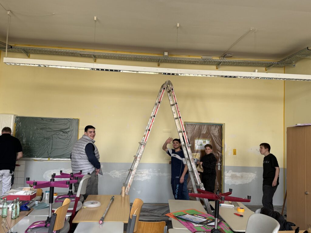 Im Rahmen dieser Aktion erhielten die Jugendlichen einen praxisnahen Einblick in den Beruf des Malers und Lackierers. Zunächst wurde das Klassenzimmer vollständig ausgeräumt, damit genügend Platz zum Arbeiten entstand. Anschließend lernten die Schülerinnen und Schüler, wie man Möbel, Fenster und Böden fachgerecht abklebt, um sie vor Farbe zu schützen.