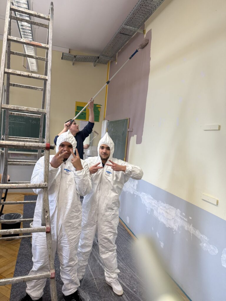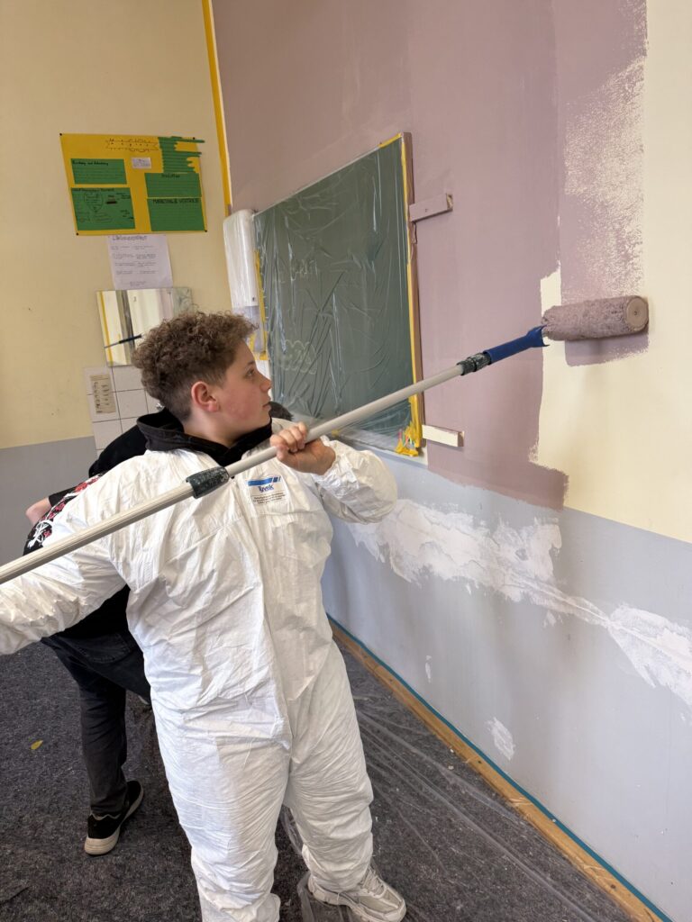 Zum Abschluss ging es schließlich an das eigentliche Streichen. Unter fachkundiger Anleitung von Herrn Gmeiner arbeiteten die Schülerinnen und Schüler mit Rolle und Pinsel und verwandelten ihr Klassenzimmer Schritt für Schritt in einen frisch gestrichenen Raum.