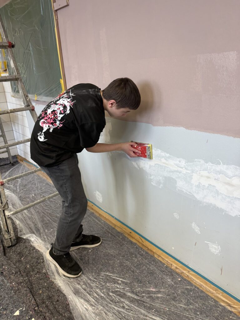 Ein weiterer wichtiger Schritt war das Spachteln kleiner Unebenheiten in den Wänden. Dabei erfuhren die Jugendlichen, wie wichtig eine sorgfältige Vorbereitung für ein gutes Endergebnis ist. Auch mathematisches Denken war gefragt: Gemeinsam berechneten sie, wie viel Farbe für die Wände benötigt wird.